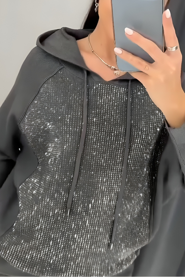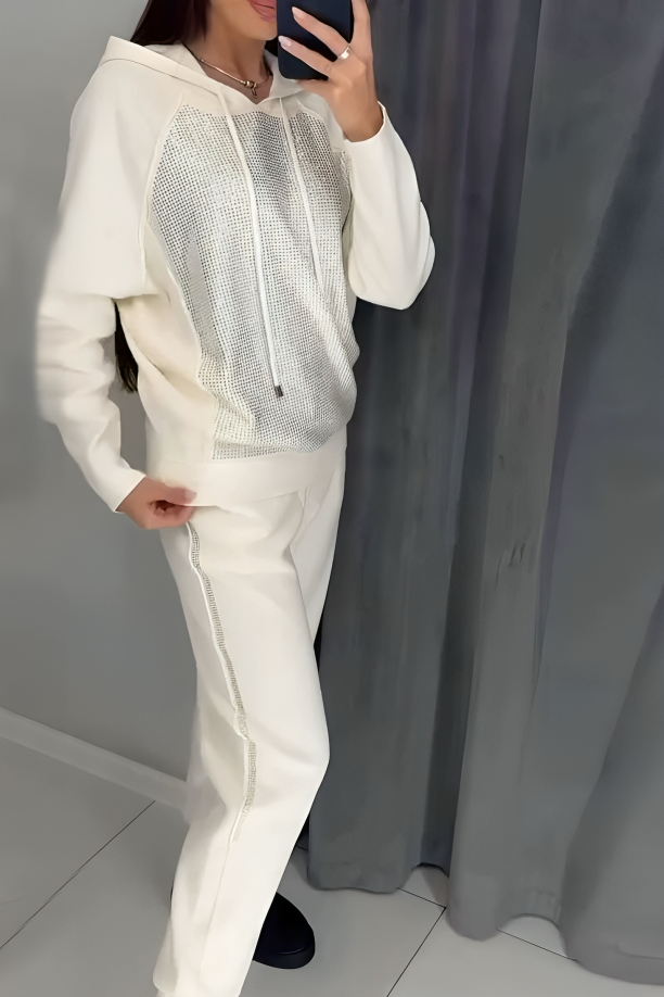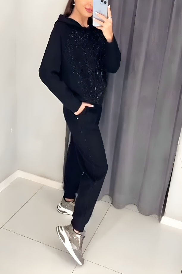 Este conjunto deportivo de algodón con capucha está diseñado para ofrecerte comodidad sin sacrificar el estilo. Cada detalles de diamantes añaden un toque de brillo a tu look cotidiano, haciéndote destacar en cualquier ocasión.